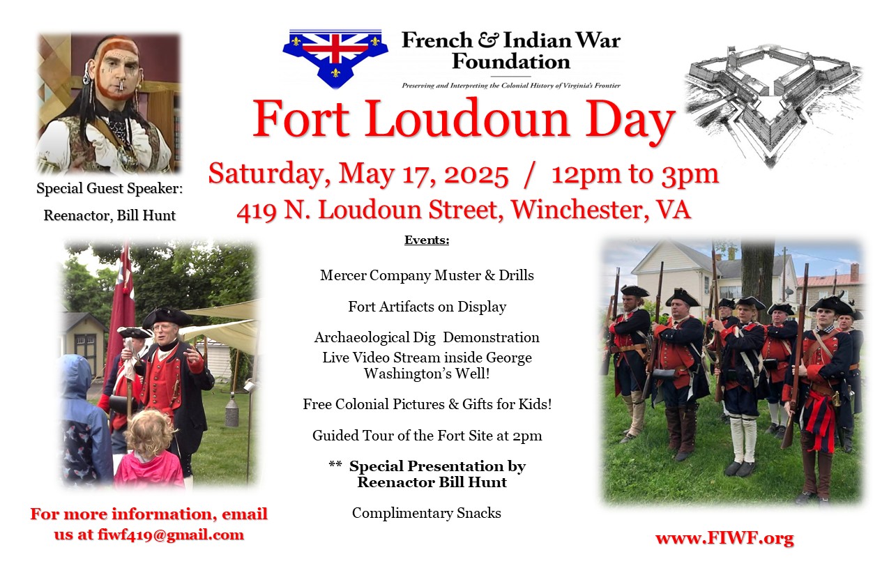 Join us to celebrate Fort Loudoun Day. On May 18, 1756, Colonel George Washington wrote a letter to Lieutenant Colonel Adam Stephen requesting support from Captain Mercers, Captain Bells, and other Companies for 50 skilled in masonry and carpentry to “carry on the work” of fort construction “with spirit and vigour“.