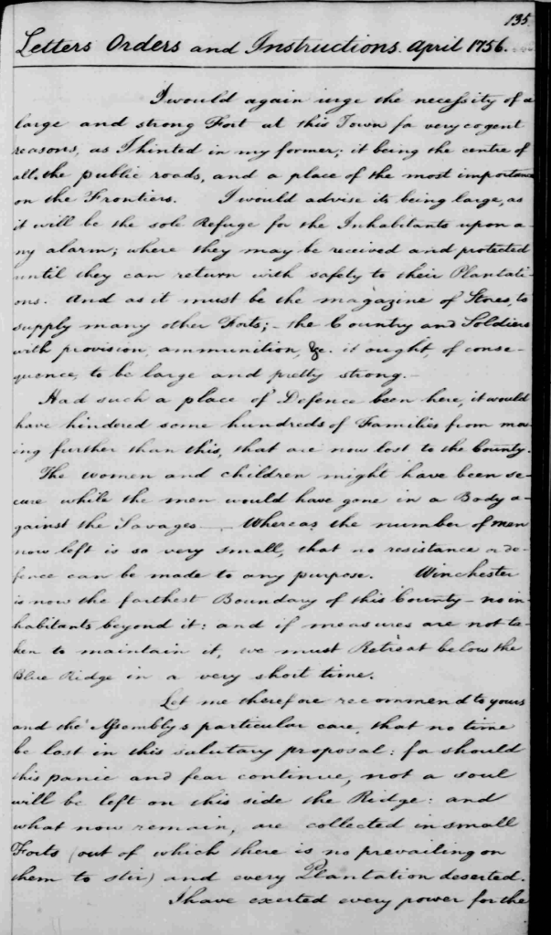 I would again urge the necessity of a large and strong fort at this town [Winchester] for very cogent reasons, as I hinted in my former, it being the center of all the public roads, and a place of the most importance on the frontiers. I would advise its being large, as it will be the sole refuge for the inhabitants upon any alarm, where they may be received and protected until they can return with safety to their plantations. And as it must be the magazine of stores, to supply many other forts, the country and soldiers with provisions, ammunition, &c., it ought, of consequence, to be large and pretty strong. […]