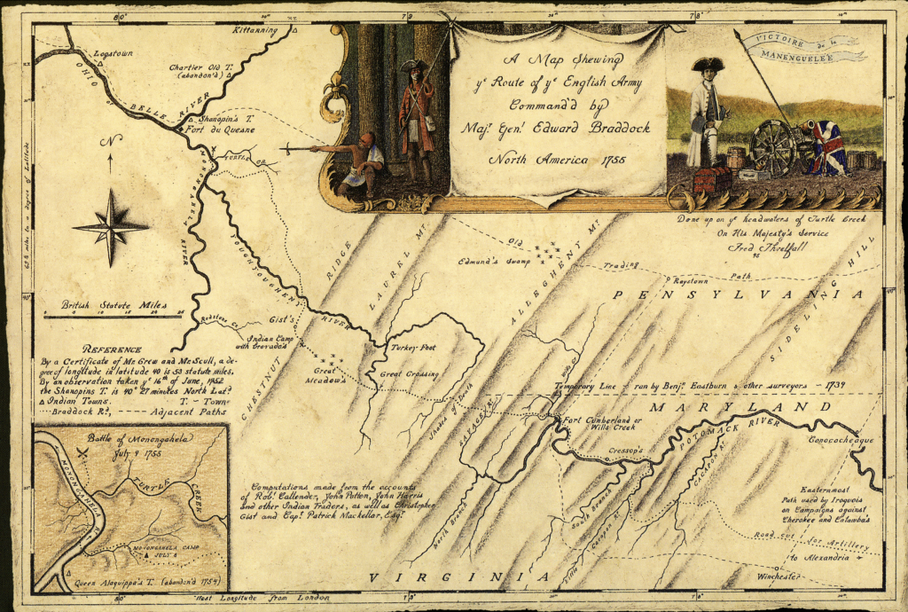 - Threlfall, F. (n.d.). 1755 Map of Braddock’s Road. Explorepahistory.com. https://explorepahistory.com/displayimage.php?imgId=1-2-8D0 ↩︎