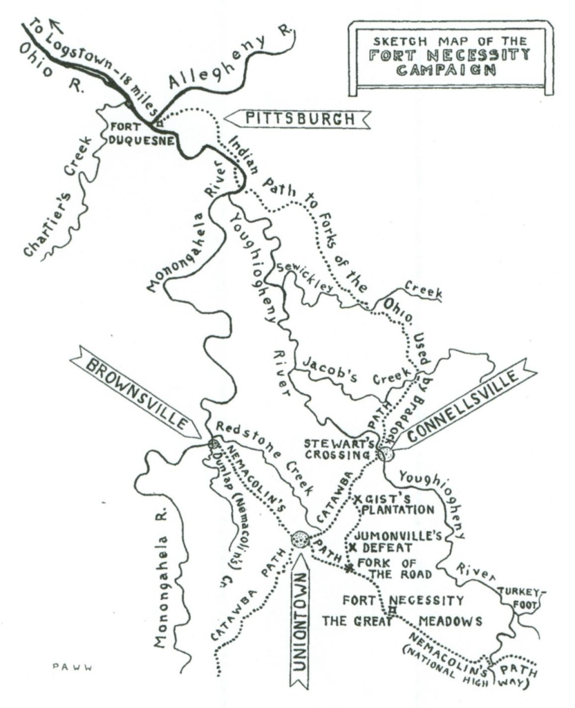 Heading for Washington’s encampment and fort at Great Meadows, Villiers came upon the site of his brother’s murder (now memorialized as Jumonville Glen) and dryly noted that there were still remnants of corpses to be seen. But “let the dead bury the dead,” for Villiers was determined to push his dedicated pursuit of Washington as quickly as possible to its inevitable climax.