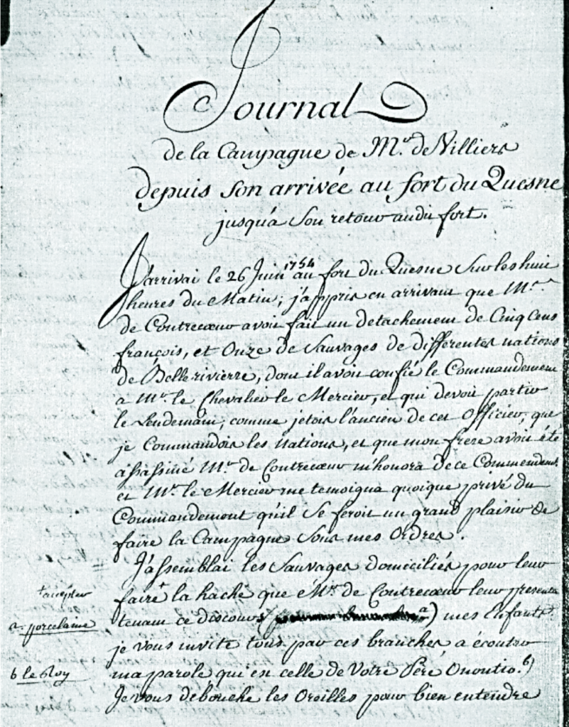 The debacle at Fort Necessity in July 1754 is one of most compulsively studied episodes in George Washington’s life, for it was his elementary school in frontier warfare; defeat is a harsher but better schoolmaster than victory. Although not consulted by American historians of the French and Indian War, the “Journal de la Campagne” that Villiers carefully kept of his campaign against Washington “ is an indispensable source for understanding the seminal events that transpired during June and July 1754.
