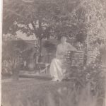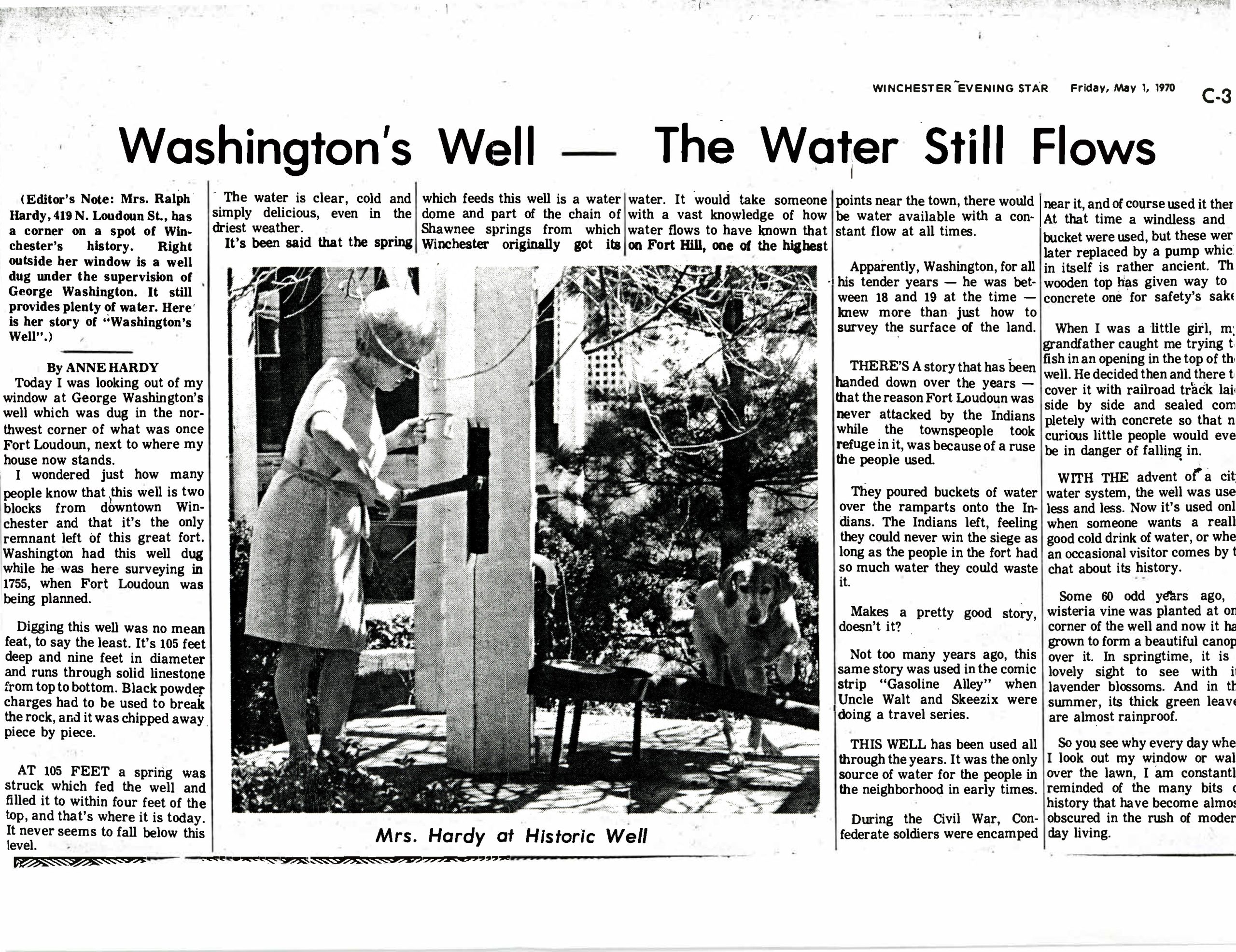 Additionally, black and white photos from the 1920’s and 1930’s were donated to the Foundation by the Chip Hardy Family. These photos show Anne Hardy, who was the owner of 419 N. Loudoun Street, and various members of the family posing with the well in the background. The freshly poured concrete is visible in many of the pictures, with a couple of them showing the wooden planks that formerly covered the well. A newspaper article written by Anne Hardy is included, as well.
