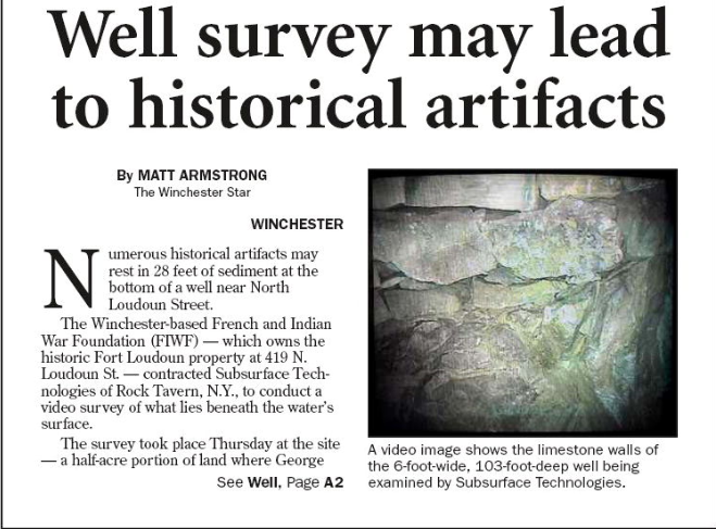 The French & Indian War Foundation wishes to express its gratitude to Subsurface Technologies, Inc. for providing their services and videotaping the interior of the Well at the Site of Fort Loudoun. You can learn more about Subsurface Technologies, Inc. and their water well services at: www.subsurfacetech.com